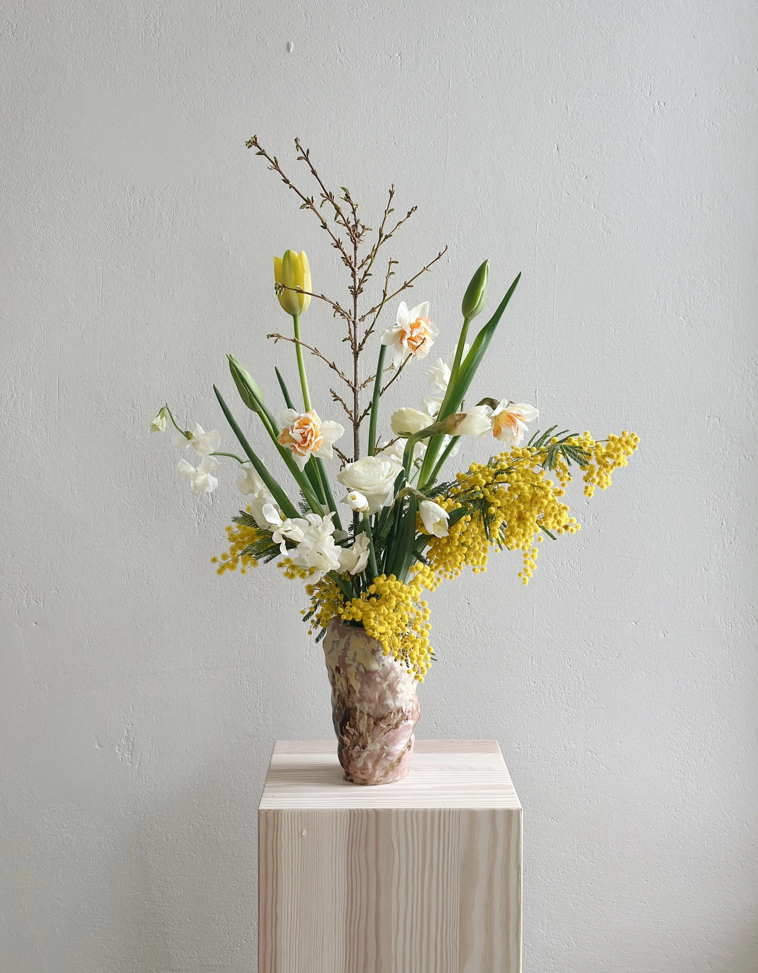 I mina buketter jobbar jag med blommor och material som är i säsong just nu. Jag skapar utifrån naturens egna form och värdesätter varje stjälk och ser till dess unika egenskaper.